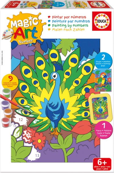 Postupně vybarvujte jednotlivé části podle návodu (každé číslo na plátně odpovídá jedné konkrétní barvě). Kreativní aktivita, která pomáhá rozvíjet soustředění, koordinaci, rozpoznávání barev a to vše zábavnou formou. Balení obsahuje: 2 obrázky o rozměru 20,5 x 15,5 cm s očíslovanými částmi, barevnou předlohu, sadu 9 barev se stojánkem, plastový rámeček na postavení a štětec.