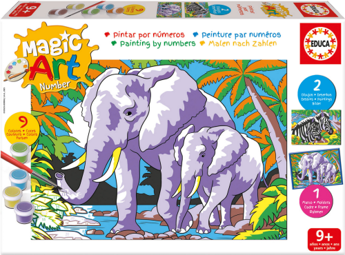 Postupně vybarvujte jednotlivé části podle návodu (každé číslo na plátně odpovídá jedné konkrétní barvě). Kreativní aktivita, která pomáhá rozvíjet soustředění, koordinaci, rozpoznávání barev a to vše zábavnou formou. Balení obsahuje: 2 obrázky o rozměru 20,5 x 15,5 cm s očíslovanými částmi, barevnou předlohu, sadu 9 barev se stojánkem, plastový rámeček na postavení a štětec.