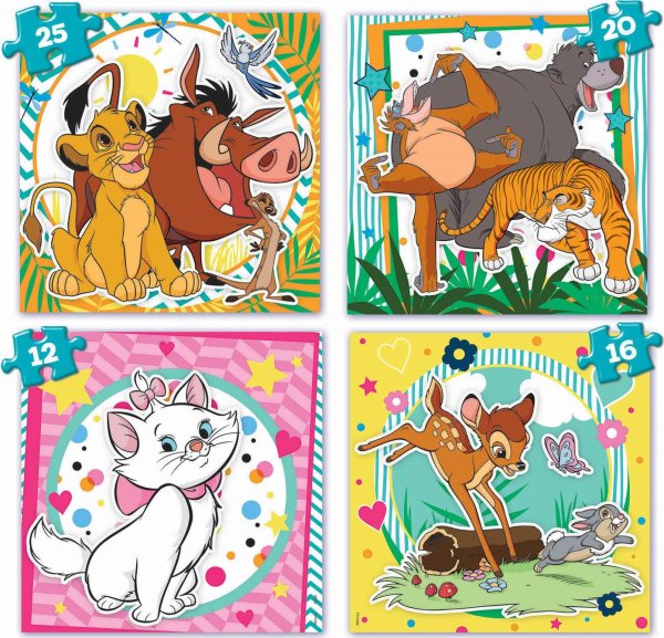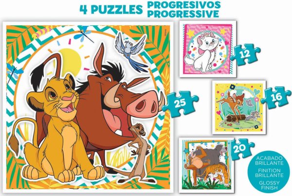 Dětské puzzle s obrázky ze známých Disney pohádek. Progresivní puzzle s různou obtížností - 4 puzzle s 12 až 25 dílky, s vyšším počtem dílků se zmenšuje jejich velikost. Puzzle je baleno v plastovém kufříku. Rozměr složeného puzzle cca 16 x 16 cm