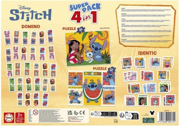 Se souborem her EDUCA SuperPack 4v1 nabízí dětem spoustu možností, jak si hrát sám nebo s kamarády. Obsah balení: puzzle s 25 dílky, puzzle s 50 dílky, domino 28 kartiček, pexeso 28 kartiček. Progresivní puzzle má stejný rozměr výsledného obrázku, ale s větším počtem dílků se zmenšuje jejich velikost. Rozměr složeného puzzle cca 33 x 24 cm
