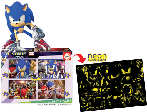 Čtyři samostatné puzzle o velikosti 34 x 24 cm, ale s různým počtem dílků (od 50 do 150), postupně vedou ke zdokonalování při skládání a zvyšování obtížnosti. Progresivní puzzle = s vyšším počtem dílků se zmenšuje jejich velikost. Neonové - fluorescenční puzzle svítící ve tmě ze série NEON FLUORESCENT. Na puzzle nanesená flurescenční vrstva barvy přes den absorbuje světlo, což způsobí, že ve tmě části puzzle svítí. Rozměr složeného puzzle cca 34 x 24 cm
