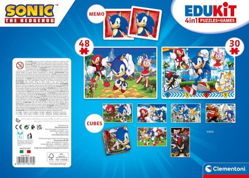 Soubor her 4v1 Sonic od Clementoni. Obsahuje puzzle 30 a 48 dílků, 6 platových kostek a pexeso. Puzzle je o stejném rozměru 24 x 17 cm, ale s různým počtem dílků, proto se s vyšším počtem dílků zmenšuje jejich velikost. Baleno v kartonové krabici s plastovým uchem pro snadné přenášení. Rozvíjí paměť, logické dovednosti a manuální zručnost. Rozměr balení: 37x26x4,6 cm. Věk 3+