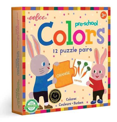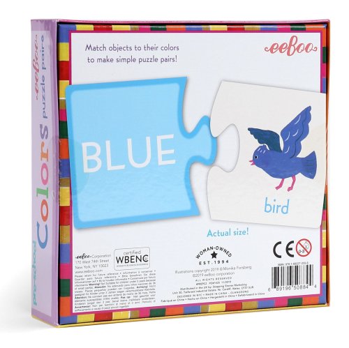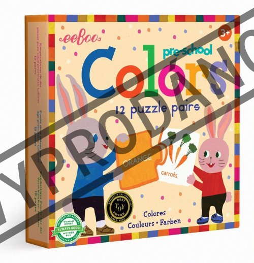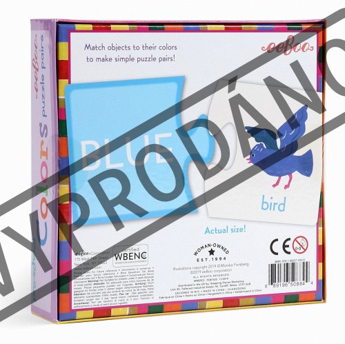 Předškolní párovací puzzle Barvy je jednoduchá přiřazovací hra, která pomáhá dětem rozvíjet rozpoznávání barev a čtenářské dovednosti. - Barevný dílek patří k dílku, na kterém je obrázek stejné barvy. - Dílky jsou vyrobeny z odolného silného kartonu. - Názvy barev a obrázků jsou uvedeny v angličtině. Vyrobeno z 90% recyklovaného šedého kartonu a tišteno inkousty na rostlinné bázi. Puzzle od amerického výrobce EEBOO. Rozměr složeného puzzle cca 16,5 X 8 cm