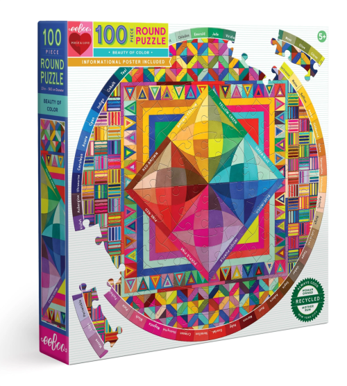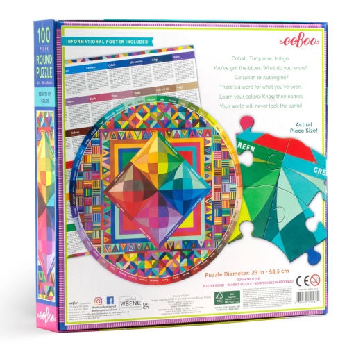 Krása barev oslavuje velkou rozmanitost barev v našem světě a mnohá slova, která používáme k jejich popisu. Bohatá barevná slovní zásoba zlepšuje zrakovou ostrost a propůjčuje přesnost tomu, jak sdělujeme, co vidíme. Vytvořeno pro starší děti, které jsou připraveny na pokročilejší témata a také pro dospělé, kteří chtějí jednodušší "svačinové" puzzle. Vyrobeno z 90% recyklovaného šedého kartonu a tišteno inkousty na rostlinné bázi. Puzzle od amerického výrobce EEBOO. Balení obsahuje: plakát 50x50 cm s vysvětlením barevné etymologie a historické anekdoty. Texty jsou v angličtině.