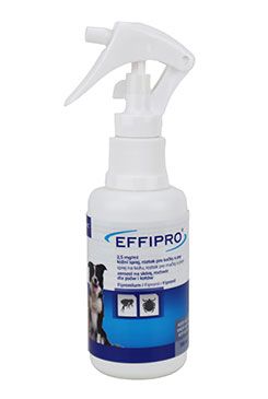 Effipro sprej je antiparazitikum pro léčbu a prevenci napadení blechami, klíšťaty a všenkami a pro léčbu a kontrolu alergie na bleší kousnutí (FAD) u psů a koček. Kožní sprej, roztok pro kočky a psy. Vyhrazený veterinární léčivý přípravek. Složení: Fipronilum 2,5 mg v 1 ml spreje (roztoku). Charakteristika: Fipronil je insekticid a akaricid náležící do skupiny fenylpyrazolů. Inhibuje GABA komplex vazbou na chloridové kanály tak, že blokuje pre- a postsynaptický přenos chloridových iontů přes buněčné membrány. Důsledkem toho je nekoordinovaná činnost centrálního nervového systému a smrt hmyzu a roztočů. Fipronil vykazuje insekticidní a akaricidní účinek proti blechám (Ctenocephalides spp), klíšťatům (Rhipicephalus spp, Dermacentor spp., Ixodes spp. včetně Ixodes ricinus) a všenkám (Trichodectes spp., A. Felicola spp.) u psa a kočky. Použití: Cílový druh zvířat: psi a kočky. Léčba infestací blechami (Ctenocephalides spp.) u psů a koček. Léčba infestací klíšťaty (Ixodes ricinus, Rhipicephalus sanguineus) u psů a koček. Léčba infestací všenkami u psů (Trichodectes canis) a koček (Felicola subrostratus). Přípravek může být použit jako součást léčebné strategie alergie na bleší kousnutí (FAD). Insekticidní účinnost proti novým infestacím dospělci blech přetrvává až 6 týdnů u koček a až 3 měsíce u psů, v závislosti na promořenosti prostředí. Přípravek má perzistentní akaricidní účinek proti klíšťatům po dobu až 4 týdnů, v závislosti na promořenosti prostředí. Kontraindikace: Nepoužívejte u nemocných zvířat (tj. celkové onemocnění, horečka) nebo zvířatům v rekonvalescenci. Nepoužívejte u králíků z důvodu nebezpečí nežádoucích reakcí až úhynu. Nepoužívejte v případě přecitlivělosti k léčivé látce nebo kterékoliv pomocné látce. Nežádoucí účinky: Pokud dojde k olíznutí, může se objevit krátkodobá hypersalivace způsobená povahou vehikula. Mezi velmi vzácně očekávanými nežádoucími účinky byly po použití přípravku udávány přechodné kožní reakce v místě aplikace (vyblednutí a vypadávání srsti, svědění, zarudnutí kůže) a celkové svědění, nebo vypadávání srsti. Výjimečně byly pozorovány hypersalivace, reversibilní neurologické symptomy (hyperesthesie, deprese, nervozita), zvracení, nebo dýchací příznaky. Laboratorní studie neprokázaly teratogenní nebo embryotoxický účinek fipronilu u potkana a králíka. Fipronil je velmi dobře snášen u štěňat po ošetření laktující feny. Údaje ke specifickým studiím v průběhu březosti u fen a samic koček nejsou k dispozici. Bezpečnost veterinárního léčivého přípravku nebyla stanovena, proto jeho použití by mělo být provedeno pouze po zvážení poměru přínosů a rizik veterinárním lékařem. Upozornění: Fipronil může nepříznivě působit na vodní organizmy. Nekontaminujte rybníky, vodní toky, nebo stoky přípravkem, nebo prázdnými obaly. Dávkování: Cesta podání a dávkování: Spray s mechanickou pumpičkou pouze k zevnímu podání. Pumpička dávkuje 0,5 ml (láhev 100 ml), nebo 1,5 ml (láhev 250 ml), nebo 3 ml (láhev 500 ml) na jedno zmáčknutí. Dávkování: Aby se zvlhčila srst až na kůži, aplikujte 3-6 ml na kg ž.hm. (7,5-15 mg účinné látky na kg ž.hm.) v závislosti na délce srsti. Dávky může být dosaženo 6-12 stisky pumpičky na kg ž.hm. u 100 ml balení, nebo 2-4 stisky pumpičky u 250 ml balení nebo 1-2 stisky pumpičky u 500 ml balení. V závislosti na délce srsti Balení 100 ml umožňuje 4-8 ošetření 4 kg kočky nebo až 3 ošetření 10 kg psa, balení 250 ml umožňuje 2-4 ošetření 20 kg psa, balení 500 ml umožňuje 2-4 ošetření 40 kg psa. Aplikace: U balení 250 ml a 500 ml nastavte trysku na "spray". Stříkejte na tělo zvířete ze vzdálenosti cca 10-20 cm. Stříkejte proti směru růstu srsti a zajistěte, aby byla veškerá srst zvlhčená. Načechrejte srst zejména u dlouhosrstých zvířat, aby mohl přípravek proniknout až na kůži. K ošetření hlavy a k ošetření mladých a neklidných zvířat nastříkejte přípravek na rukavici a jemně vetřete do srsti. Nechejte přirozeně zaschnout. Nevysušujte vytíráním ručníkem. Nastavte trysku. Stříkejte proti směru růstu srsti, psa přidržujte. Široký střik na zadní část těla a boky, zvíře stojí. Široký střik na hruď a břicho, zvíře sedí anebo leží. Úzký střik na tlapy a záhyby kůže, zvíře stojí. Pro oblast tlamy nastříkejte přípravek na rukavici. Vlastnosti: Přípravek obsahuje složku, která na srsti vytváří film a srst se může lesknout. Program ošetření by měl být založen na místní epidemiologické situaci z důvodu nejvhodnějšího tlumení infestací blechami a/nebo klíšťaty. Vzhledem k absenci studií týkajících se bezpečnosti přípravku je minimální interval mezi aplikacemi 4 týdny. Štěňata a koťata od 2 dnů věku mohou být bezpečně ošetřena. Přípravek není vhodný k přímému ošetření prostředí.