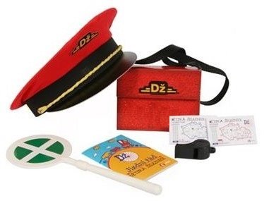 Sada obsahuje nutné potřeby pro tuto profesi - červenou čepici, plácačku, píšťalku, jízdní řád, sadu jízdenek a papírovou brašnu.