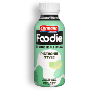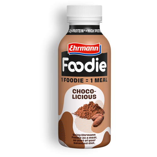 1 Foodie = 1 jídlo. Ehrmann Foodie je lahodné jídlo v podobě nápoje s důležitými živinami, které vaše tělo potřebuje. Láhev o obsahu 400 ml obsahuje 30 g bílkovin, neobsahuje laktózu, lepek a přidané cukry*.