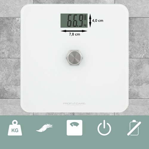 Kinetická osobní váha ProfiCare® nabízí přesná měření bez použití baterií tím, že generuje vlastní energii krátkým stisknutím tlačítka napájení. Tato bezbateriová osobní váha je díky své samogenerující energii šetrná a udržitelná k životnímu prostředí. Extra velký, kvalitní skleněný povrch (cca 31 x 31 cm) je nejen elegantní, ale také odolný proti poškrábání a snadno se čistí a zajišťuje dlouhou životnost vaší váhy. Extra velký LCD displej zajišťuje optimální čitelnost. Můžete si vybrat mezi jednotkami měření kg nebo lb a využít rozsah měření 5–180 kg v krocích po 100 g. Automatické vypnutí, indikátory nízké energie a přetížení a protiskluzové nožičky zajišťují bezpečné a snadné použití váhy. Rozsah měření je 5-180 kg, kdy měří po 100 g. Její povrch (hygienický, odolný proti škrábancům) vyžaduje jen minimální péči a stačí ji jednou za čas otřít od prachu. Rozměry plochy: cca 31 x 31 cm. Její spodní část je vybavena protiskluzovými nožičkami, čímž je zabráněno nežádoucímu pohybu po podlaze. Automatické vypnutí po měření šetří energii.