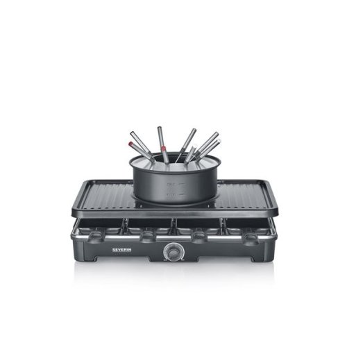 Severin RG 2347 Kombinace raclette-fondue Výkon 1400 W Až pro 8 oso, obsahuje 8 pánví a špachtle Grilovací deska a nádoba na fondue s keramickým povrchem Nastavitelný termostat s LED podsvíceným …