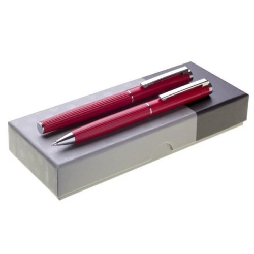 Dárková sada s červenou propiskou a rollerem v dárkové papírové krabičce.