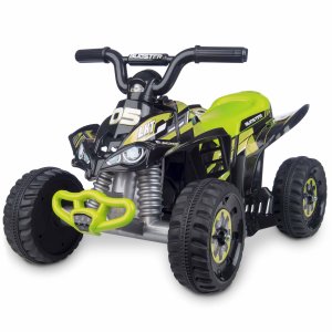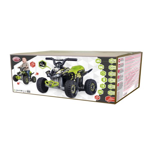 Elektrická čtyřkolka. Rozměry 46x72x46 cm. Jen zelená barva. Baterie 7.4V (15-18W, 3 Ah). Nosnost 30 kg. Rychlost 2,4 km/h.