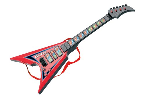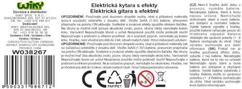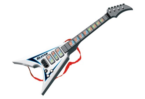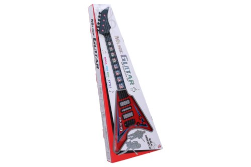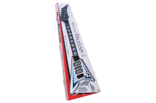 Elektrická kytara. Rozměry 22x5x56 cm. Světelné a zvukové efekty. 3xAA baterie nejsou součástí. Přepínač ON/OFF vedle potenciometrů. Oba potenciometry světelné a zvukové efekty. 2 varianty - bílá, červená.