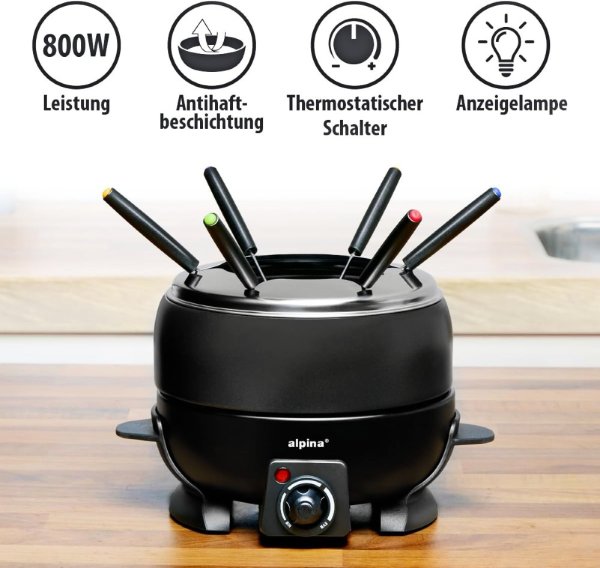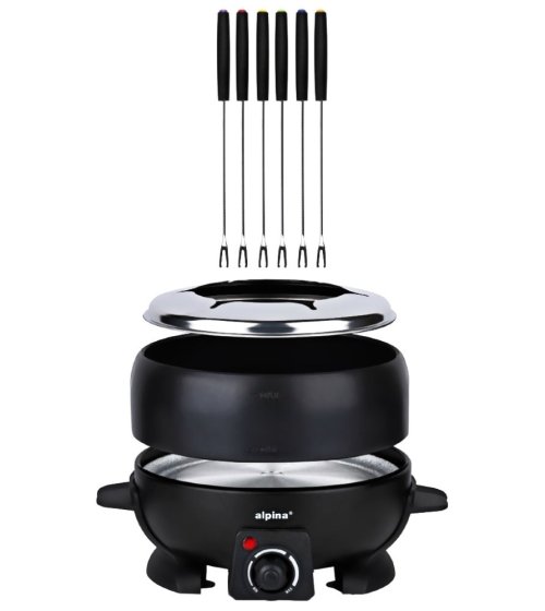 Proměňte své setkání s rodinou a přáteli v nezapomenutelný zážitek s elektrickou sadou na fondue Alpina. Tento výkonný a všestranný fondue set vám umožní snadno a rychle rozpustit sýr, čokoládu i omáčky nebo rozehřát olej, díky čemuž se hodí pro každou příležitost – od romantické večeře až po zábavné párty! Elektrické fondue je nejpohodlnější a nejrychlejší přístroj pro přípravu fondue. Nemusíte čekat, než se rozpálí hořlavá pasta nebo přikládat pod fondue nekonečné množství svíček.