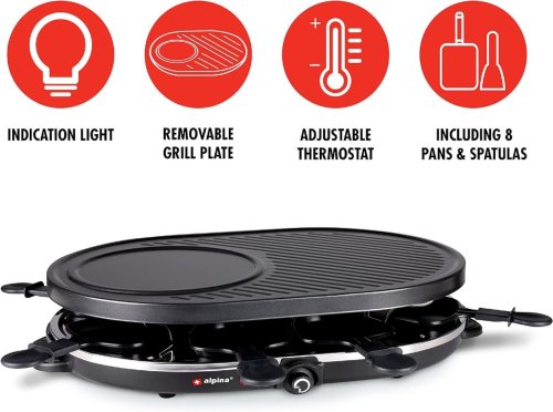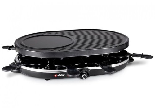 Raclette 8 osob – tato sada obsahuje raclette sadu s grilovací deskou a 8 pánvičkami a špachtlemi, takže se u stolu může místo posadit velká skupina.