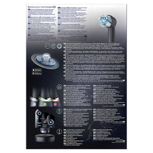 Kartáček iO v černé barvě je určen pro citlivé zuby a dásně. Kombinuje ikonickou kulatou kartáčkovou hlavu Oral-B s unikátními jemnými mikrovibracemi, takže umožňuje dosáhnout 100% zdravějších dásní už za jeden týden než běžný manuální zubní kartáček. Chytrý senzor tlaku signalizuje pomocí červené, bílé nebo zelené barvy kontrolky, zda při čištění tlačíte příliš, málo nebo správně. Interaktivní barevný displej OLED ukazuje důležité informace, včetně režimů čištění a připomínky výměny kartáčkové hlavy, pozdravu, když ho zapnete, a úsměvu za dobře odvedenou práci. Magnetická rychlonabíječka zajišťuje rychlé nabití asi za 3 hodiny. Vylepšený inteligentní tlakový senzor signalizuje červenou, bílou nebo zelenou barvou, aby vás upozornil, zda kartáčujete příliš silně, příliš jemně nebo se správným tlakem. Sedm chytrých režimů pro čištění na míru: pro každodenní čištění, jemný, péče o dásně, intenzivní čištění, bělicí, super jemný, čištění jazyka. Funkce 3D mapování zubů s umělou inteligencí sleduje, jak si čistíte přední, horní a zadní plochy zubů a vede vás tak, aby bylo čištění co nejdůkladnější. Pro vaše nejlepší výsledky a zážitek z čištění si stáhněte aplikaci Oral-B, připojte k ní kartáček a pravidelně ji aktualizujte.