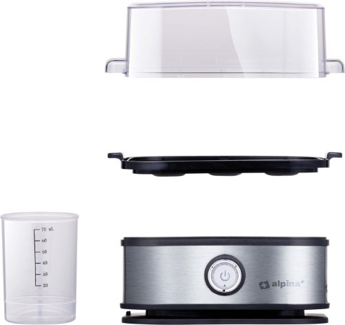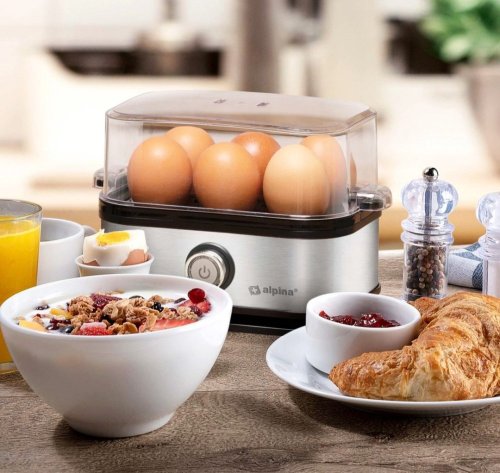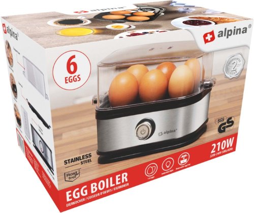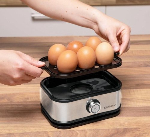 S elektrickým vařičem vajec Alpina můžete uvařit až 6 vajec současně přesně tak, jak je máte rádi. V návodu najdete, jak dlouho potřebujete vařit počet vajec v elektrickém vařiči najednou na požadovanou úroveň. Přiloženou odměrkou se špendlíkem na vejce provrtejte ve vejcích dírku, abyste zabránili prasknutí během vaření. Výrobek má kontrolku, která signalizuje, kdy je připraven k použití. Poté, co jsou vejce hotová, můžete je snadno vyjmout z vařiče vajec pomocí vyjímatelné skořápky.