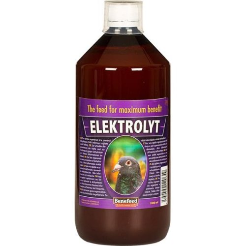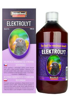 Pro rychlou regeneraci sil a prevenci dehydratace. Přesně vypočtený a dlouhodobě ověřený poměr účinných látek rychle a účinně pomůže holubům v regeneraci sil po náročném závodě. Velice rychle dojde k vyrovnání tekutin v buňce, na minimum se zkracuje svalová únava, což je nezbytné zejména v závodní sezoně. ELEKTROLYT je vysoce účinný přípravek s obsahem elektrolytů umožňující velmi rychle a spolehlivě příjem kationtů, aniontů a snadno využitelných uhlohydrátů. Má přímý vliv na rozložení tekutin v těle a přenos elektronáboje ve svalech a tím i vyšší výkonnost. Při zátěži účinně brání úniku elektrolytů z organismu. ELEKTROLYT také vyrovnává ztrátu minerálních látek při průjmech a jiných onemocněních. Podává se při svalové únavě, metabolické zátěži organismu a v případech, kdy hrozí přehřátí organismu (např. z horka). Zabraňuje dehydrataci organismu a tím i možnému uhynutí. Vysoká účinnost přípravku je dána speciální technologií výroby, kdy jsou aktivní látky obdukcí chráněny před degradací v žaludku a zažívacím traktu. Tento ochranný obal je postupně odbouráván, až dojde k úplnému uvolnění aktivní látky v organismu v její maximální účinnosti. Složení: minerální látky, vitamíny, přírodní látky, upravená pitná voda Podání a dávkování: Podává se 1 den před letem a 2 dny po příletu ze závodu, dále se podává v horkých letních dnech, při průjmech a horečkách v množství 10 ml na 1 litr napájecí vody. Pokud nepodáváte do napájecí vody, je nutné zajistit holubům dostatek vody! Přípravek lze kombinovat a současně podávat s jakýmkoliv výrobkem značky BENEFEED® pro konkrétní kategorii zvířat.