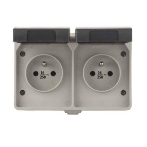 produkt: zásuvka dvojnásobná s ochrannými kolíky a víčky s propojením design: FRENCH typ: 250 V~/16 A max. barva: šedo-černá způsob montáže: na stěnu krytí: IP44 provedení: 2 nás. voděodolná …