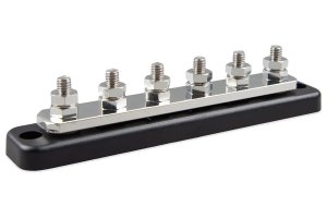 Victron DC přípojnice 250 A 6P; DC přípojnice (busbar) se používá pro distribuci vysokého DC proudu a současně také slouží jako připojení pro baterie a/nebo DC zařízení .
