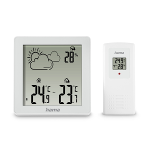 Hama Action; Set složený ze základny a bezdrátového čidla nabízí digitální měření vnitřní i venkovní teploty a vlhkosti vzduchu .