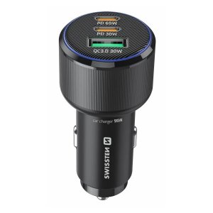 Výkonná autonabíječka s celkovým výkonem 95 W a třemi porty (2× USB-C PD 3.0, 1× USB-A QC 4.0).