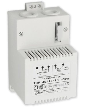 Pulsar TRAFO kryté 40 VA; Transformátor pro napájení ústředen s plastovým krytem zcela kryjícím "živé" části trafa, se svorkovnicí a tavnou pojistkou.