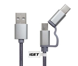 Univerzální datový a nabíjecí kabel o délce 1 m s konektorem USB-C prodloužená verze a microUSB prodloužená verze, 2 A s podporou rychlého nabíjení.