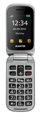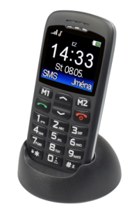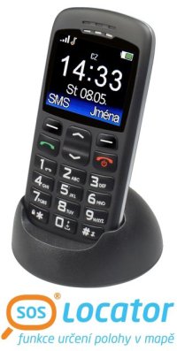 Klasický telefon pro seniory s SOS tlačítkem, možností obrázkového tel. seznamu a funkcí určení polohy SOS locator, s podporou dvou SIM karet.