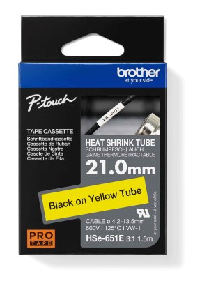 HSE-651E - NOVÁ, ŽLUTÁ originální bužírka, smrštitelnost 3:1, šířka 21,0 mm, černý tisk na žluté, délka 1,5 m z řady PRO Tape (design černo-modrého balení) *Nutné si stáhnout a aktualizovat firmware …