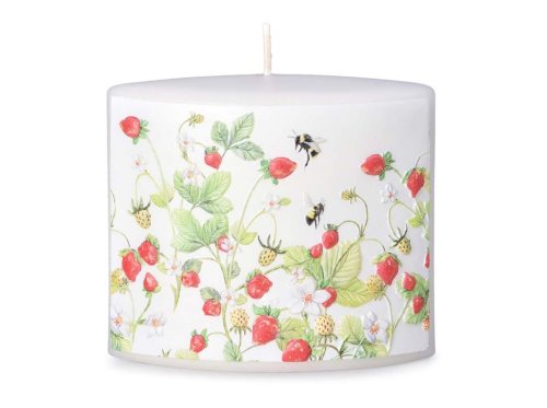 Svíčka ve tvaru elipsy s motivem jahod. Přidejte do svého prostoru svěží a veselý vzhled s tímto roztomilým motivem, který oživí každý interiér. Její rozměry jsou 115x53x100mm.