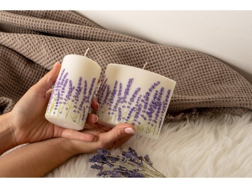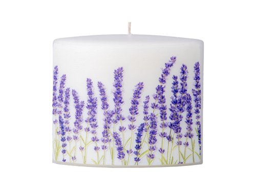 Svíčka ve tvaru elipsy s motivem levandule. Elegantní a uklidňující motiv levandule je ideální pro vytvoření relaxační atmosféry. Její rozměry jsou 115x53x100mm.