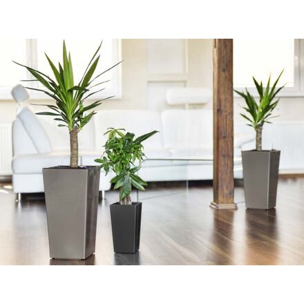 Stylový dekorativní květináč Elise Lesk s lesklým povrchem je ideálním doplňkem domů i na zahradu. Hranatý květináč s vyjímatelnou nádobou je vyrobený z pevného plastu, který je odolný proti mrazu a s UV stabilizátorem, takže ho bez obav můžete nechat na zahradě přes zimu i přes slunečné léto. Květináč má integrovaný šroubovatelný přepad pro odtok dešťové vody. Model Elise Lesk 15 má zabudovaný samozavlažovací systém s knoty. K modelům Elise Lesk 20 / 25 / 30 lze dokoupit samozavlažovací systém Smart System Elise. Květináč má v každém rohu háčky pro komfortní vytažení vnitřní nádoby. Parametry: Elise Lesk 15 Výška: 26 cm Délka horní hrany: 14,5 cm Výška prostoru pro sázení: 15 cm Elise Lesk 20 Výška: 36,5 cm Délka horní hrany: 19 cm Výška prostoru pro sázení: 20 cm Elise Lesk 25 Výška: 46,5 cm Délka horní hrany: 24 cm Výška prostoru pro sázení: 25 cm Elise Lesk 30 Výška: 57,5 cm Délka horní hrany: 28,5 cm Výška prostoru pro sázení: 30 cm
