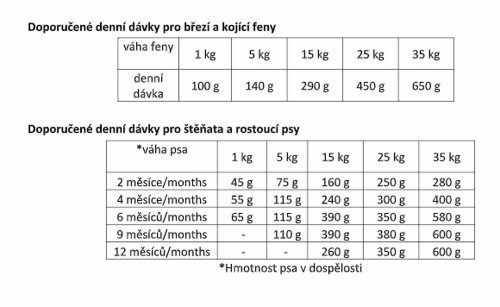 Receptura plně pokrývá požadavky mladého organismu malých a středních plemen. Vysoký obsah lehce stravitelných kuřecích bílkovin a optimální obsah tuků dodávají štěňatům dostatek energie a společně s vyváženým poměrem makro a mikroprvků, vitamínů a dalších účinných látek zajišťují správný růst a vývoj štěněte.