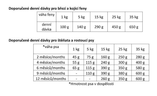 | Váha psa v dospělosti | 1 kg | 3 kg | 5 kg | 7 kg | 10 kg | 15 kg | 20 kg | 25 kg | 30 kg | 35 kg |