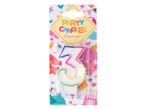 Dortová svíčka Emocio je vyrobena z bílého vosku s barevným okrajem, ve tvaru číslice 3. Tato svíčka může být použita k oslavě narozenin, výročí nebo jiné události. Svíčka má bílý plastový zápich, který usnadňuje její umístění na dort. Svíčka by neměla být umístěna v průvanu.