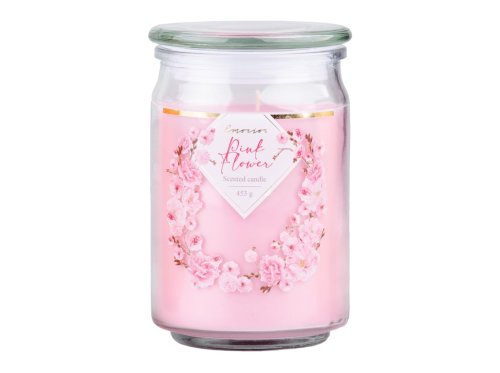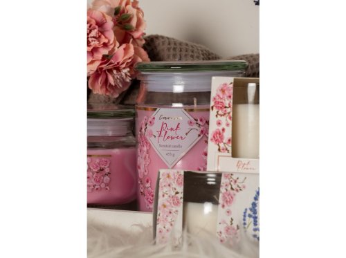 Skleněná svíčka v růžové barvě s květinovým motivem, která bude krásným doplňkem vašeho interiéru.