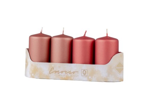 Sada čtyř válcových svíček Emocio o rozměru 40×75 mm v elegantním metalicky matném provedení. Barevná kombinace vínové a bronzové je dodávána v mixu, jednotlivé svíčky se mohou lišit odstínem.