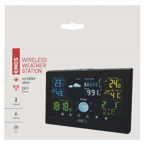 Nejdůležitější parametry síťový adaptér ano, 5 V DC/300 mA (součástí balení) možné další čidlo až 3 čidla (E06018) dosah čidla až 100 m barometr ano velikost displeje 168 × 93 mm projekce ne Ostatní parametry možnost pověšení na zeď ano drátová sonda k čidlu ne venkovní teplota -50 °C až +70 °C, rozlišení 0,1 °C venkovní vlhkost 1 % až 99 % RV, rozlišení 1 % předpověď počasí ano hodiny řízené DCF signálem min. a max. teplota ano trvalé podsvícení ano fáze měsíce ano datum ano trend tlaku ano napájení stanice 3× 1,5 V AAA (nejsou součástí balení) provedení bezdrátové kalendář ano vnitřní teplota -10 °C až +50 °C, rozlišení 0,1 °C srážkoměr ne trend teploty ano LED podsvícení displeje ano korekce nadmořské výšky ano barevný displej (black mask) podsvícený ano 12/24 formát času ano napájení čidla 2× 1,5 V AAA (nejsou součástí balení) budík ano, 2× vnitřní vlhkost 1 % až 99 % RV, rozlišení 1 % anemometr ne teplotní výstraha ano časová pásma ano produkt meteostanice elektronické plošné podsvícení ano opakované buzení ano možnost nastavení jednotky teploty °C/°F přenosová frekvence 433 MHz rozměr čidla 15 × 62 × 100 mm rozměr hlavní jednotky 17 × 192 × 127 mm prodejní obal 1 ks, krabička