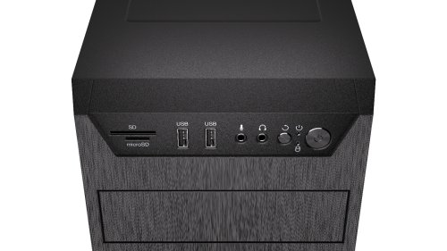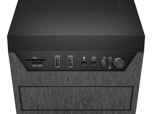 Konektory na předním panelu: 2× USB 3.2 Gen1 (USB 3.0), 1× sluchátkový výstup, 1× vstup pro mikrofon, 1× čtečka SD karet, 1× čtečka microSD karet
