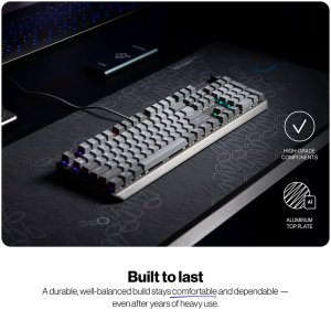 Klávesnice je vyrobena z prémiových materiálů a vyztužena pevnou hliníkovou horní deskou, díky čemuž nabízí robustní a vyvážený pocit při používání. Tři vrstvy akustické pěny PORON, EPDM a IXPE minimalizují ozvěnu a eliminují dutý zvuk při psaní pro čistý a uspokojivý akustický zážitek.