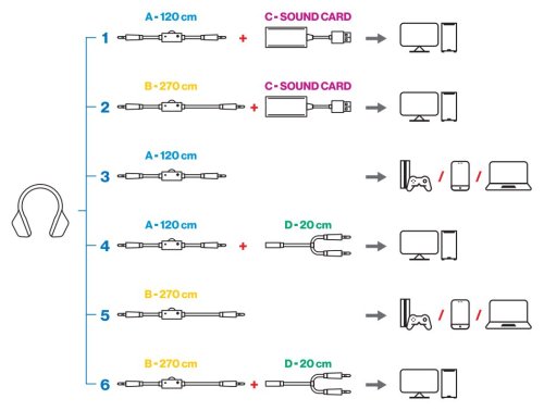 Součástí balení jsou náhradní textilní náušníky, dva kabely s konektory 3,5 mm jack (120 cm a 270 cm), krytka mikrofonního vstupu a redukce z combo jacku na dva samostatné výstupy pro mikrofon a sluchátka.