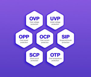 Zdroj obsahuje kompletní sadu elektrických a tepelných ochran včetně ochrany proti přetížení (OVP), podpětí (UVP), nadproudu (OCP), zkratu (SCP), přetížení (OPP), zapínacímu proudu (SIP) a přehřátí (OTP). Tyto prvky zajišťují maximální bezpečnost připojených komponentů.