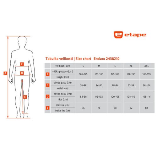Sportovní kalhoty ETAPE Enduro jsou ideální volbou pro muže, kteří hledají pohodlné a funkční kalhoty na cyklistiku, běhání či jen běžné nošení. Kalhoty jsou vyrobené z lehkého a elastického materiálu X6. Materiály z řady X jsou velmi prodyšné a zároveň odolné proti oděru a opotřebení. Ideálně tedy kombinují požadavky pro oblečení na sport a volný čas. Kalhoty se zapínají na dva cvočky se zipem a dva pásky na suchý zip slouží pro pohodlné stažení. Kalhoty mají 2 kapsy na zip, poutko na rukavice a brýle, ventilační otvory pod koleny, elastické panely u kotníků pro pohodlné oblékání a jsou bez vnitřní cyklistické vložky. - prodyšný a elastický materiál X6 - elastický panel vzadu pro větší pohodlí při jízdě na kole - pásky pro pohodlné stažení v pase - 2 kapsy na zip - poutko na rukavice a brýle - anatomické tvarování kolen - možnost použití chrániče kolen - ventilační otvory pod koleny - elastické panely u kotníků pro pohodlné oblékání - reflexní bezpečnostní prvky - bez vnitřních kalhot s cyklistickou vložkou Velikostní tabulka v obrázcích. Uvedené hodnoty jsou pouze orientační a vhodná velikost se může lišit dle konkrétního typu postavy.