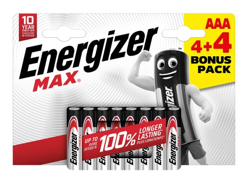 ENERGIZER MAX jsou kvalitní alkalická baterie s extra výkonem pro přístroje s každodenním použitím. Vydrží výrazně déle než zinkochloridové baterie a než běžné alkalické baterie. Technologie PowerSeal garantuje, že baterie nevytečou do přístroje až 2 roky po jejich úplném vybití. Skladovatelnost baterií je 10 let. Ideální do dálkových ovladačů, svítilen a hraček.