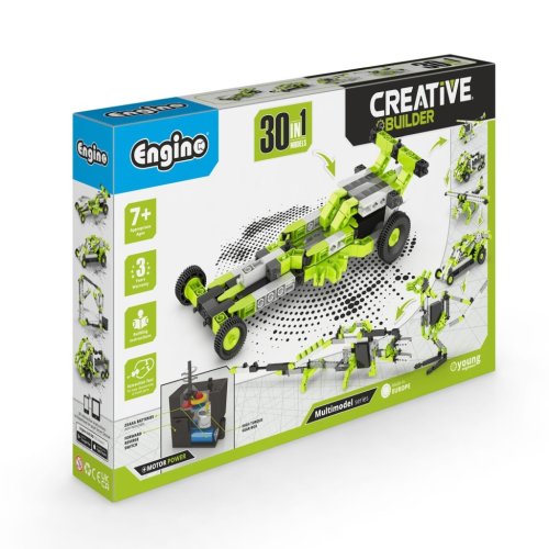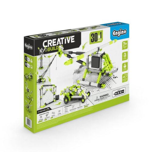Stavebnice Engino Creative Builder 30 modelů s motorkem je určena pro děti od 7 let a nabízí rozsáhlé možnosti tvoření a rozvíjení manuálních dovedností. Díky této stavebnici lze z jednotlivých dílků sestavit až 30 různých modelů, mezi které patří například závodní auto, vrtulník, jeřáb, tahač, větrný mlýn, motorka či dinosaurus. Konstrukce stavebnice je založena na kombinaci výrazných zelených, černých, bílých a šedých plastových dílků, které jsou pevné a umožňují snadné sestavení i rozebrání modelů.
