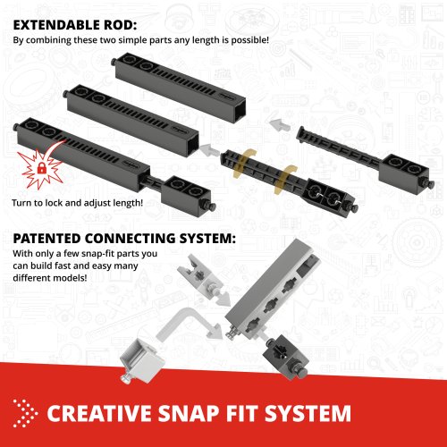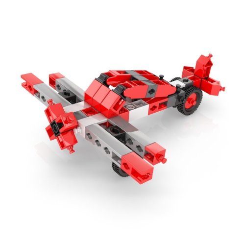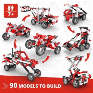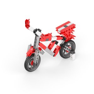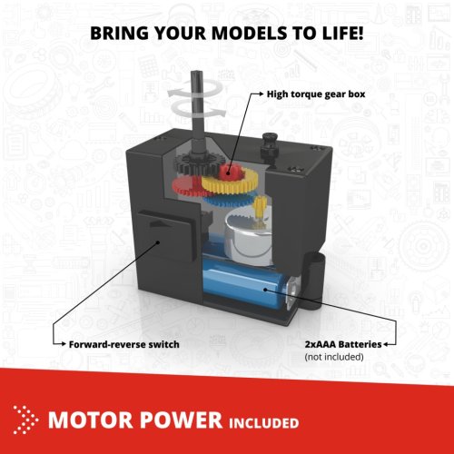 Součástí stavebnice je i motorek s vysokým točivým momentem, který umožňuje uvést sestavené modely do pohybu. Motorek je vybaven přepínačem směru jízdy a pohání modely pomocí dvou baterií AAA, které nejsou součástí balení. Díky této funkci mohou děti prožít radost z pohyblivých modelů, jako jsou například vrtulník, motorka nebo různé typy vozidel. Konstrukční díly stavebnice jsou převážně červené, černé a bílé barvy, což vytváří atraktivní a moderní vzhled hotových modelů.