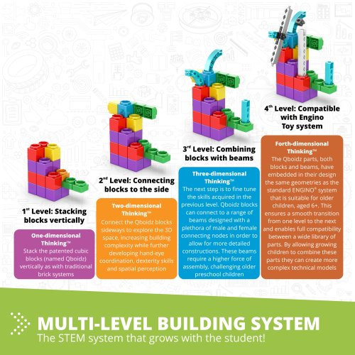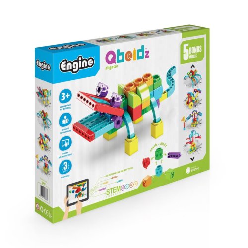Stavebnice Engino Qboidz Aligátor je navržena speciálně pro předškolní děti od 3 let a nabízí pět různých modelů k sestavení, které podporují kreativitu i rozvoj motorických a kognitivních dovedností. Díky jasným a pestrým barvám jednotlivých dílků je stavebnice vizuálně atraktivní a snadno přitahuje pozornost malých objevitelů. Součástí balení je kromě tištěného návodu také přístup k interaktivní mobilní aplikaci Engino kidCAD®, která umožňuje prohlížet modely ve 3D a krok po kroku pomáhá s jejich sestavováním.