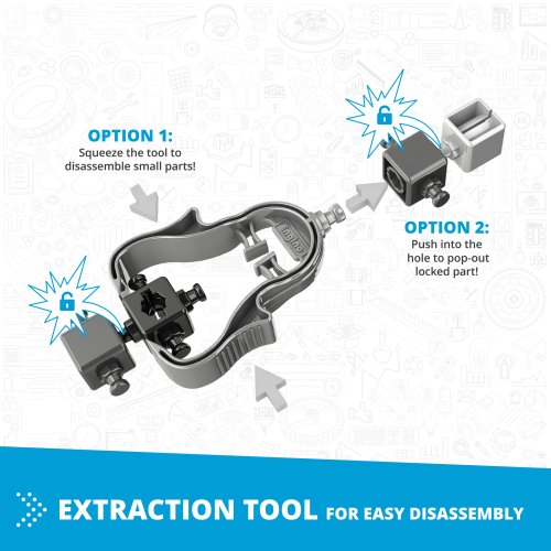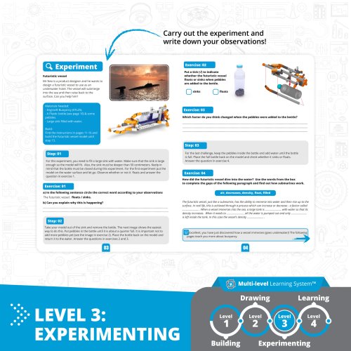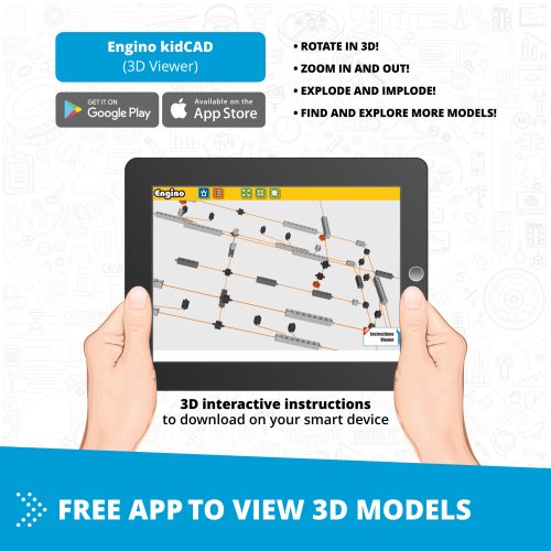 možnost sestavit 4 modely, stavebnice umožňuje: 1. level sestavení modelu, 2. level vymalování papírových dílů, 3. level experimentování, 4. level učení se, aplikace Engino kidCAD zobrazující 3D model