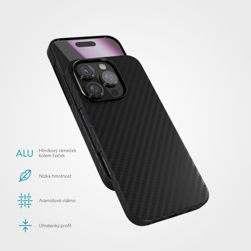 Kryt na telefon, pro Apple iPhone 16 Pro, kompatibilní s MagSafe, materiál aramidové vlákno, hliníkový rámeček kolem objektivů, barva černá.