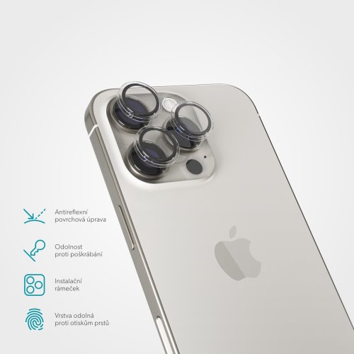 Ochrana pro čočky fotoaparátu, pro Apple iPhone 16 Pro/16 Pro Max, tvrzené sklo, tvrdost 9H, součástí: instalační rámeček.